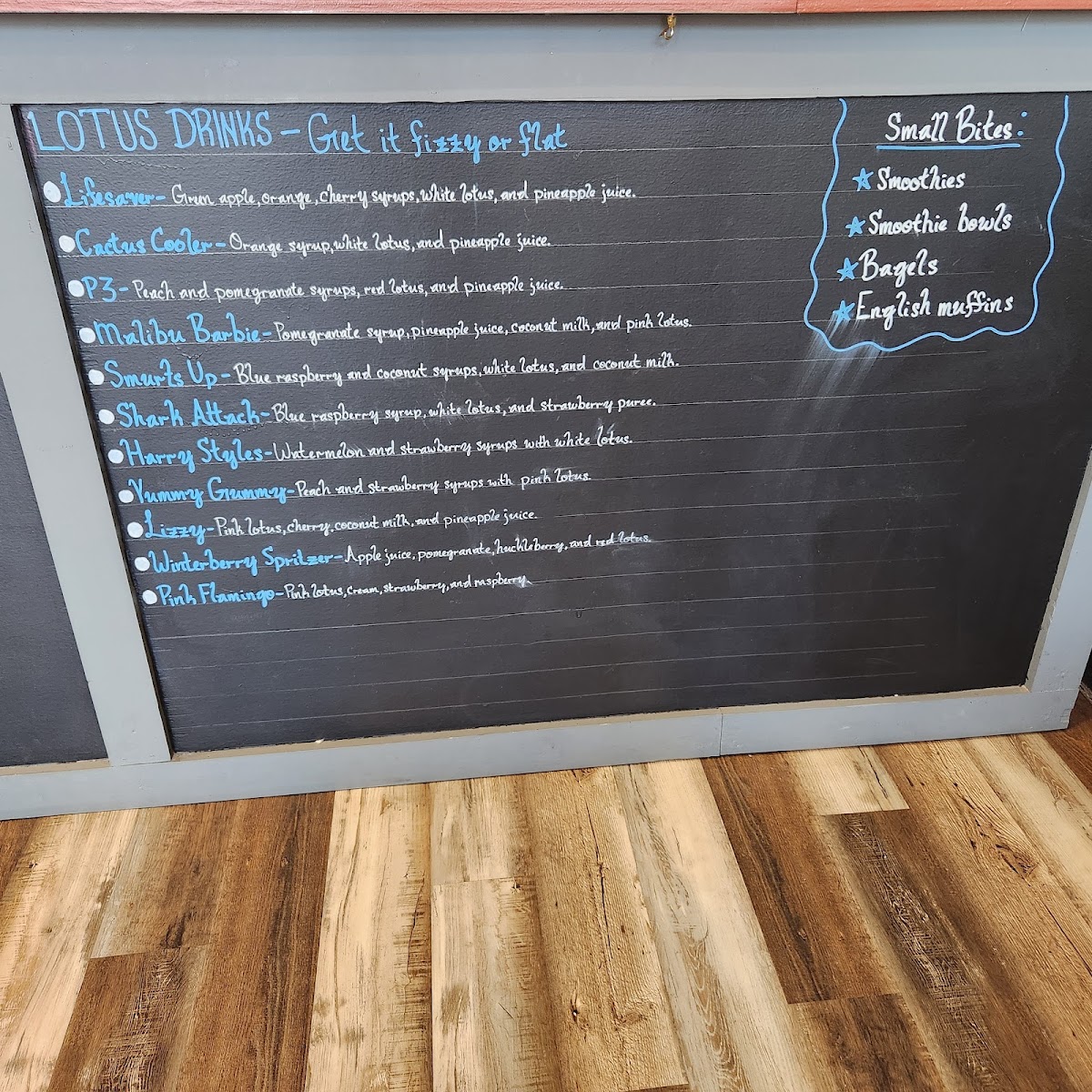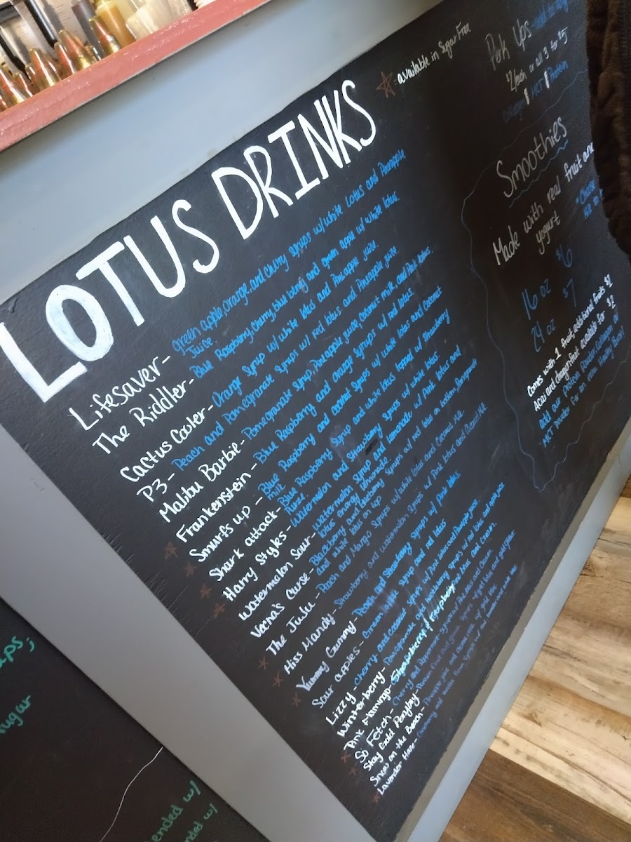 The Small Bites section adds a refreshing twist to the menu with Smoothies and Smoothie Bowls, making it an ideal choice for a light, nutritious snack or a post-workout treat. These options are perfect for those looking for a healthy yet satisfying way to fuel up. If you’re in the mood for something more adventurous, the Lotus Drinks are a real highlight of the menu. Unique concoctions like "P3," "The Riddler," and "LifesaverFrankenstein" are fun, vibrant choices that stand out. Meanwhile, the "Malibu Barbie" Lotus Drink brings a tropical flair, offering a sweet, energizing boost with every sip.